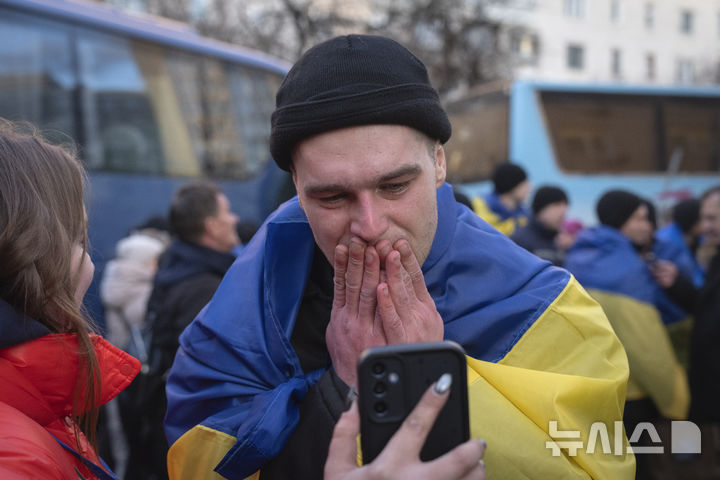 [체르느히우=AP/뉴시스] 19일(현지 시간) 러시아와 우크라이나 간 포로 교환을 마치고 체르느히우로 귀환한 우크라이나 군인이 가족과 영상 통화를 하면서 눈물을 흘리고 있다. 러시아와 우크라이나는 이날 전쟁포로 175명씩을 맞교환했다. 2025.03.20 |