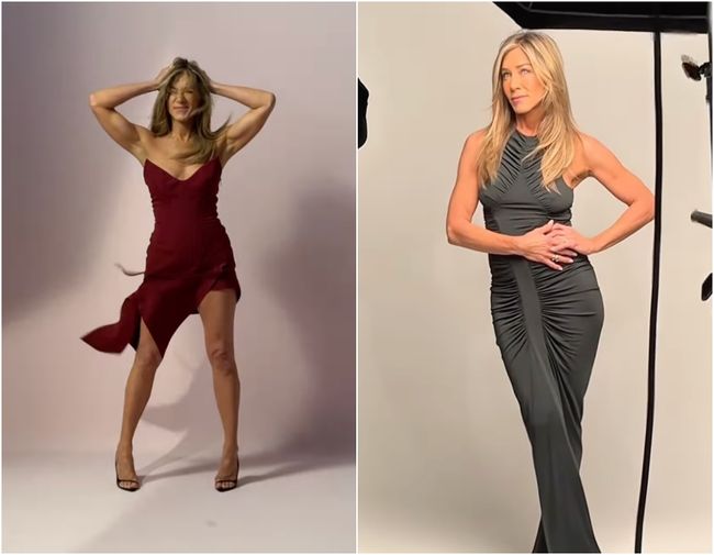 지난 2월 56세가 된 애니스톤은 탄탄한 몸매를 강조하는 두 가지 종류의 몸에 꼭 끼는 드레스를 입고 시선을 징중시켰다. 주름 장식이 들어간 짙은 회색의 롱드레스와 깊이 파인 버건디 색상의 비대칭 드레스는 애니스톤의 탄탄한 몸매를 더욱 부각했다.