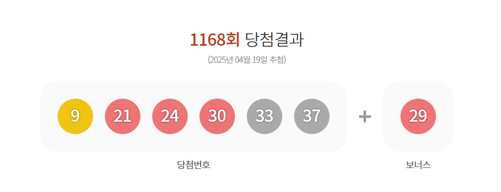 1168회 로또 당첨번호 '9·21·24·30·33·37'…보너스 번호 '29'