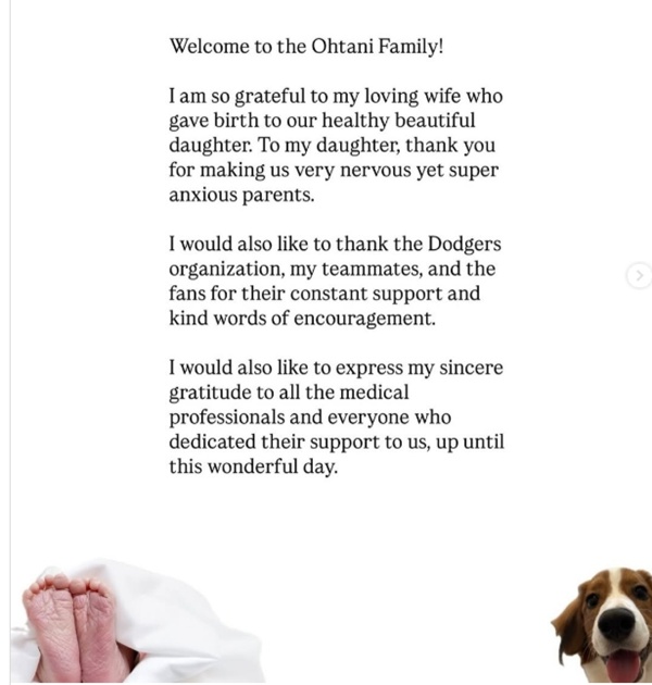 오타니는 20일(한국시각) 자신의 SNS를 통해 "건강하고 예쁜 딸을 낳은 내 사랑스러운 아내에게 감사하다. 우리를 매우 걱정 많은 부모로 만든 딸에게 감사하다"며 득녀 소식을 전했다.
