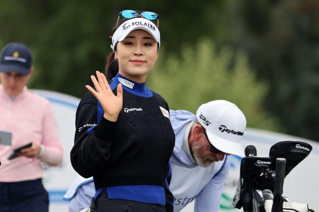 윤이나가 지난 18일(한국시간) 미국 캘리포니아주 타자나의 엘 카발레로 컨트리 클럽에서 열린 JM 이글 LA 챔피언십(총상금 375만 달러) 1라운드에서 손을 들며 인사하고 있다. [사진=AFP·연합뉴스] |