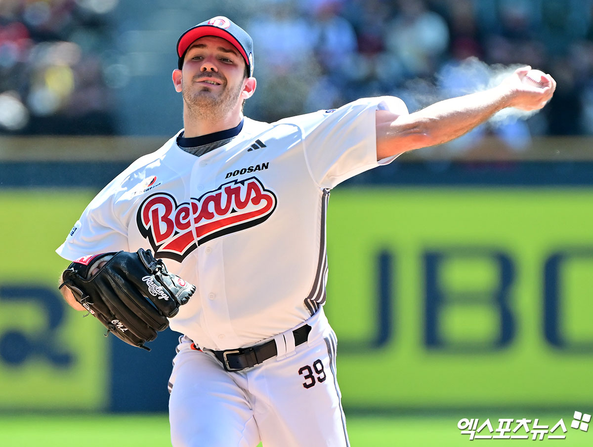 (엑스포츠뉴스 잠실, 김한준 기자) 20일 오후 서울 송파구 잠실야구장에서 열린 '2025 신한 SOL Bank KBO리그' KIA 타이거즈와 두산 베어스의 경기, 1회초 두산 선발투수 잭 로그가 공을 힘차게 던지고 있다.