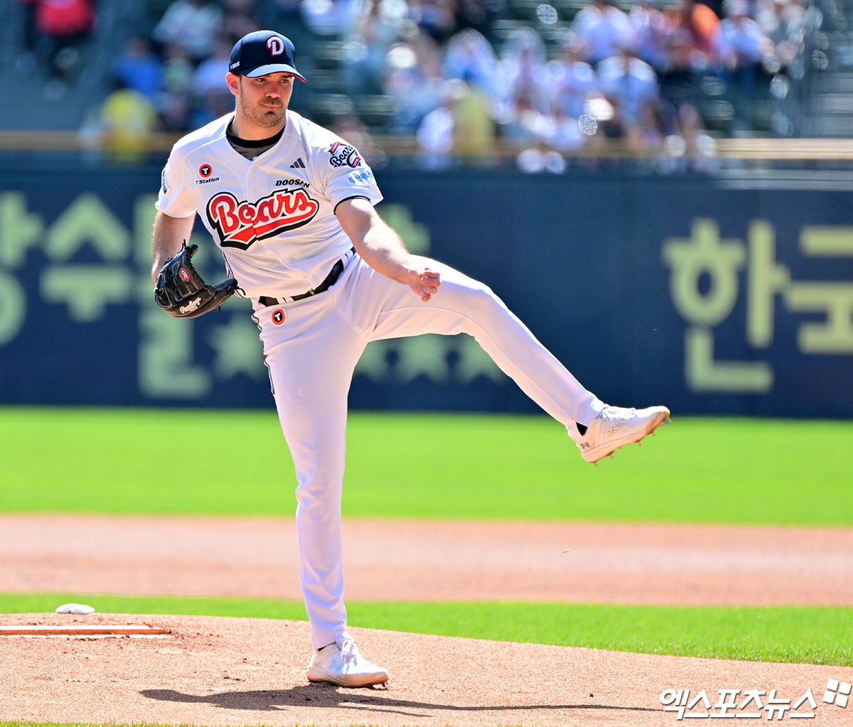 (엑스포츠뉴스 잠실, 김한준 기자) 20일 오후 서울 송파구 잠실야구장에서 열린 '2025 신한 SOL Bank KBO리그' KIA 타이거즈와 두산 베어스의 경기, 1회초 두산 선발투수 잭 로그가 공을 힘차게 던지고 있다.