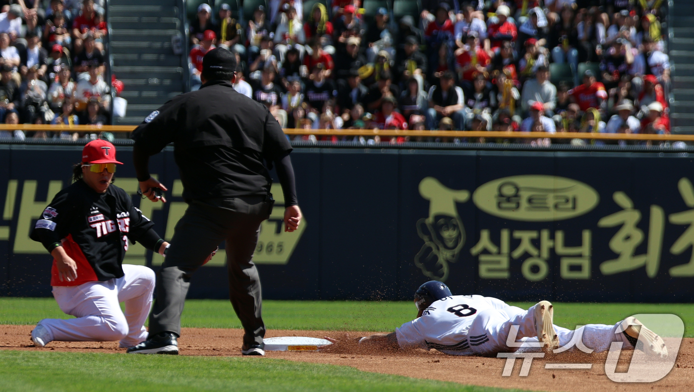 (서울=뉴스1) 김명섭 기자 = 20일 오후 서울 송파구 잠실야구장에서 열린 '2025 신한 SOL뱅크 KBO 리그' 기아 타이거즈와 두산 베어스의 경기에서 1회말 두산 공격 2사 1루 상황, 1루 주자 케이브가 도루를 성공시키고 ㅣ있다. 2025.4.20/뉴스1