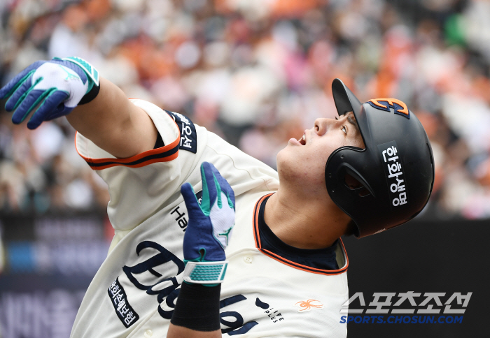20일 대전 한화생명볼파크에서 열린 NC-한화전. 2회말 무사 노시환이 솔로포를 친 후 관중석으로 기념 인형을 던지고 있다. 대전=정재근 기자 cjg@sportschosun.com/2025..4.20/