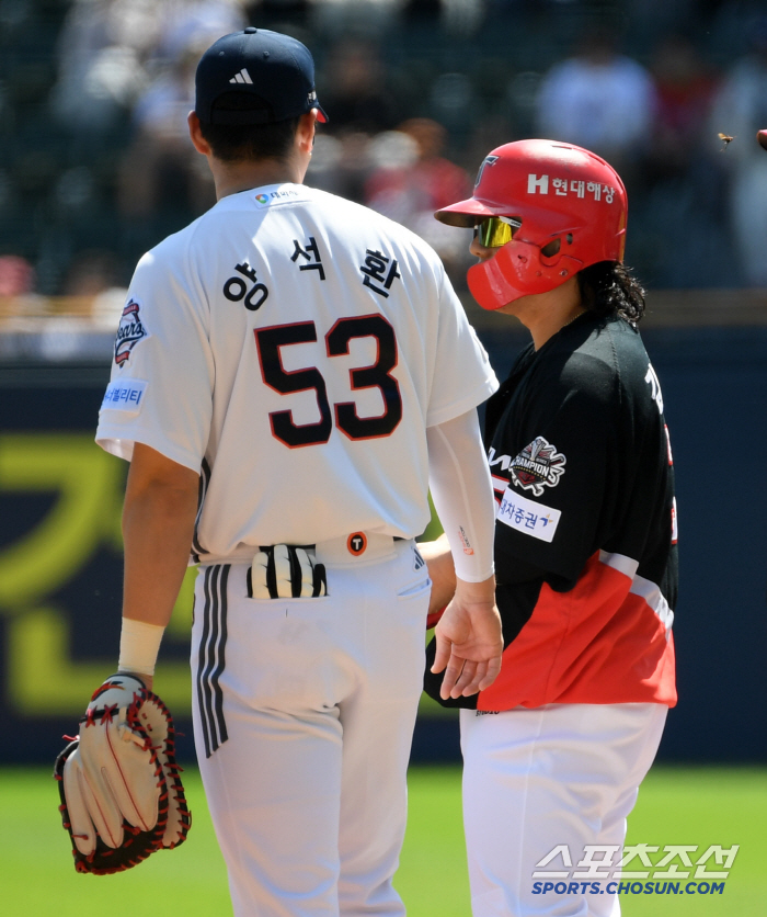 20일 잠실구장에서 열린 두산 베어스와 KIA 타이거즈의 경기. 1회초 1사 두산 양석환이 볼넷 출루한 KIA 김선빈을 걱정하고 있다. 잠실=박재만 기자 pjm@sportschosun.com/2025.04.20/