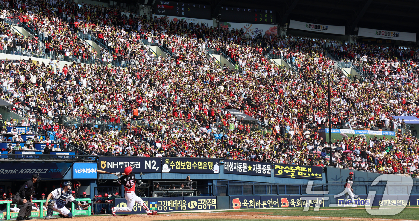 (서울=뉴스1) 김명섭 기자 = 20일 오후 서울 송파구 잠실야구장에서 열린 '2025 신한 SOL뱅크 KBO 리그' 기아 타이거즈와 두산 베어스의 경기에서 만원 관중이 열띤 응원을 하고 있다. 2025.4.20/뉴스1