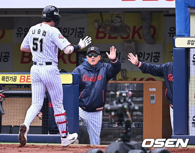 롯데 자이언츠 나승엽이 2회초 중월 솔로 홈런을 치고 하이파이브를 하고 있다. 2025.04.20 / foto0307@osen.co.kr