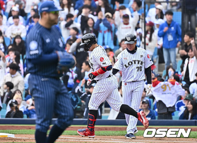 롯데 자이언츠 유강남이 2회초 1사 1루 좌중월 2점 홈런을 치고 하이파이브를 하고 있다. 2025.04.20 / foto0307@osen.co.kr