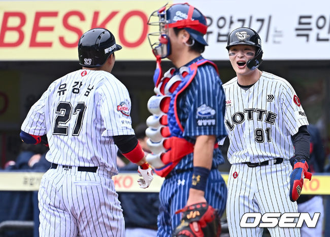 롯데 자이언츠 유강남이 2회초 1사 1루 좌중월 2점 홈런을 치고 하이파이브를 하고 있다. 2025.04.20 / foto0307@osen.co.kr