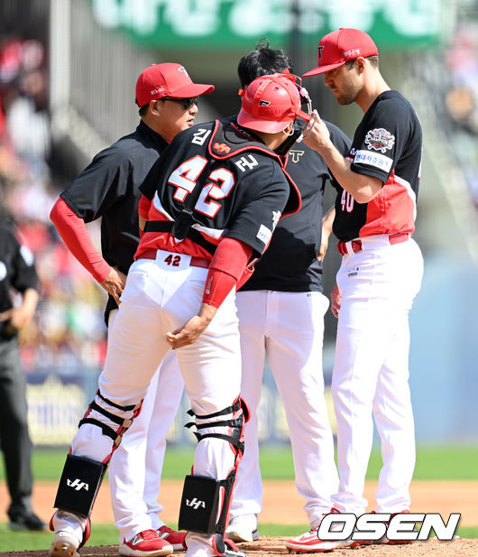 4회말 무사 1루에서 마운드를 방문한 KIA 정재훈 코치가 네일과 이야기를 나누고 있다. 2025.04.20 /sunday@osen.co.kr