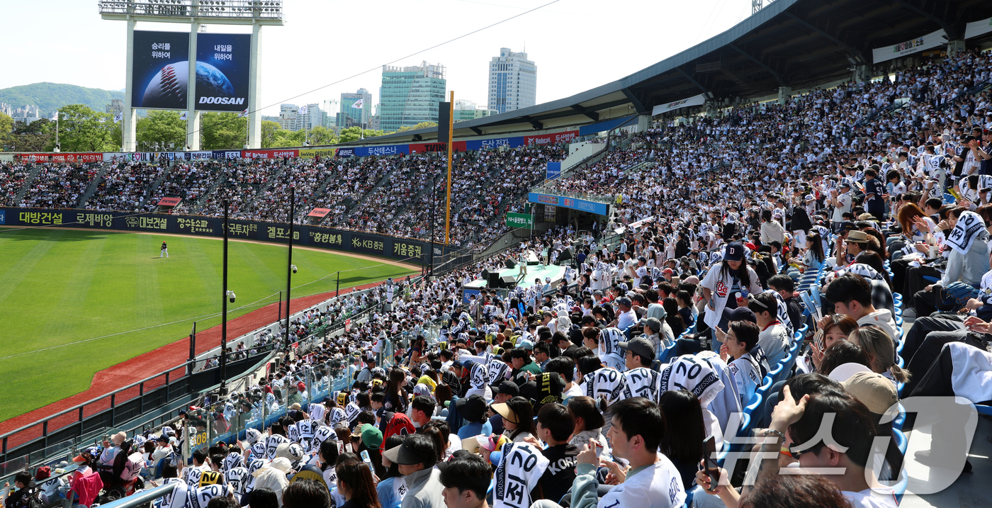 (서울=뉴스1) 김명섭 기자 = 20일 오후 서울 송파구 잠실야구장에서 열린 '2025 신한 SOL뱅크 KBO 리그' 기아 타이거즈와 두산 베어스의 경기에서 만원 관중이 열띤 응원을 하고 있다. 2025.4.20/뉴스1