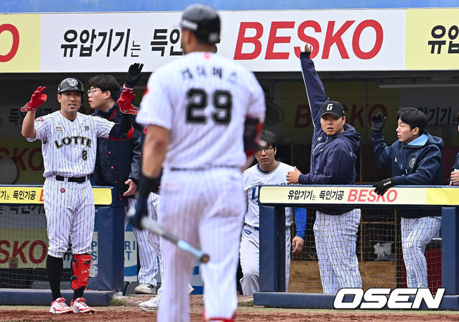 롯데 자이언츠 레이예스가 5회초 2사 우측 큰 타구를 바라보고 있다. 동료들은 모두 팔을 번쩍 들고 홈런을 예상했지만 파울. 2025.04.20 / foto0307@osen.co.kr