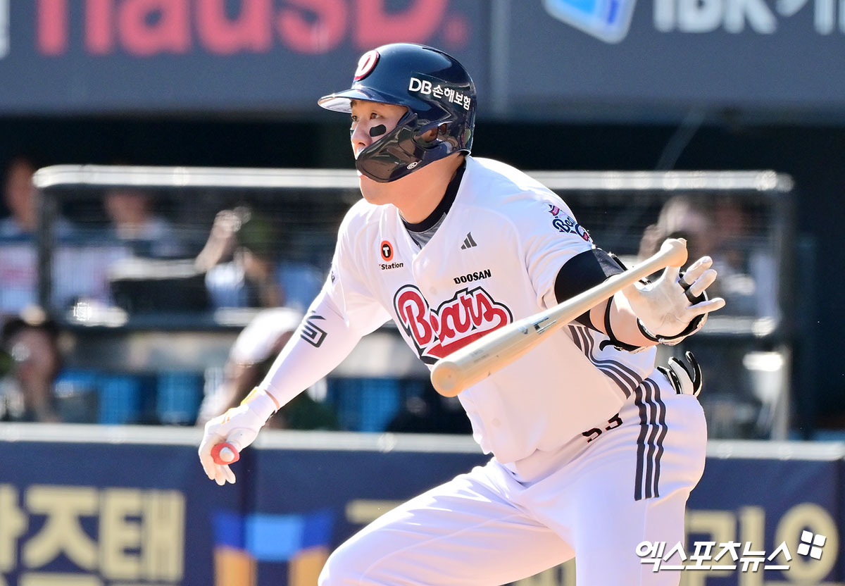 (엑스포츠뉴스 잠실, 김한준 기자) 20일 오후 서울 송파구 잠실야구장에서 열린 '2025 신한 SOL Bank KBO리그' KIA 타이거즈와 두산 베어스의 경기, 6회말 무사 1루 두산 양석환이 2루타를 날리고 있다.