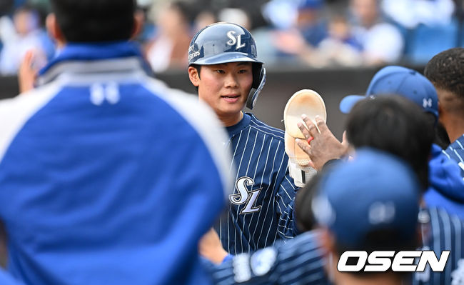 삼성 라이온즈 이창용이 6회말 1사 1,3루 김영웅의 우익수 앞 1타점 안타때 득점을 올리고 하이파이브를 하고 있다. 2025.04.20 / foto0307@osen.co.kr