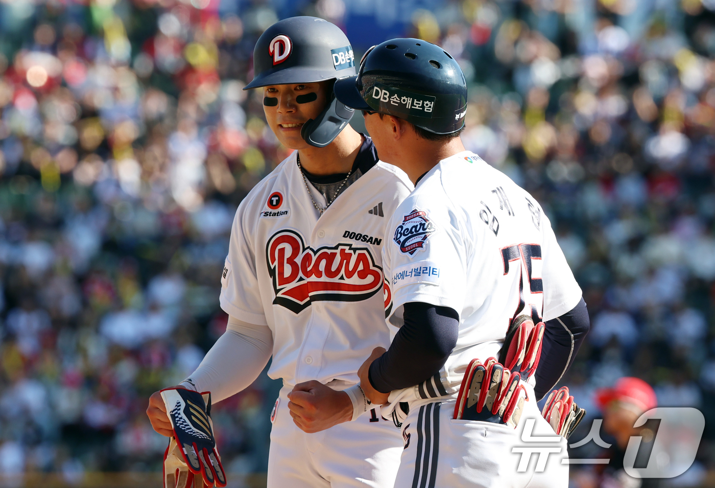 (서울=뉴스1) 김명섭 기자 = 20일 오후 서울 송파구 잠실야구장에서 열린 '2025 신한 SOL뱅크 KBO 리그' 기아 타이거즈와 두산 베어스의 경기에서 6회말 두산 공격 1사 2,3루 상황, 박준영이 2타점 안타를 치고 기뻐하고 있다. 2025.4.20/뉴스1
