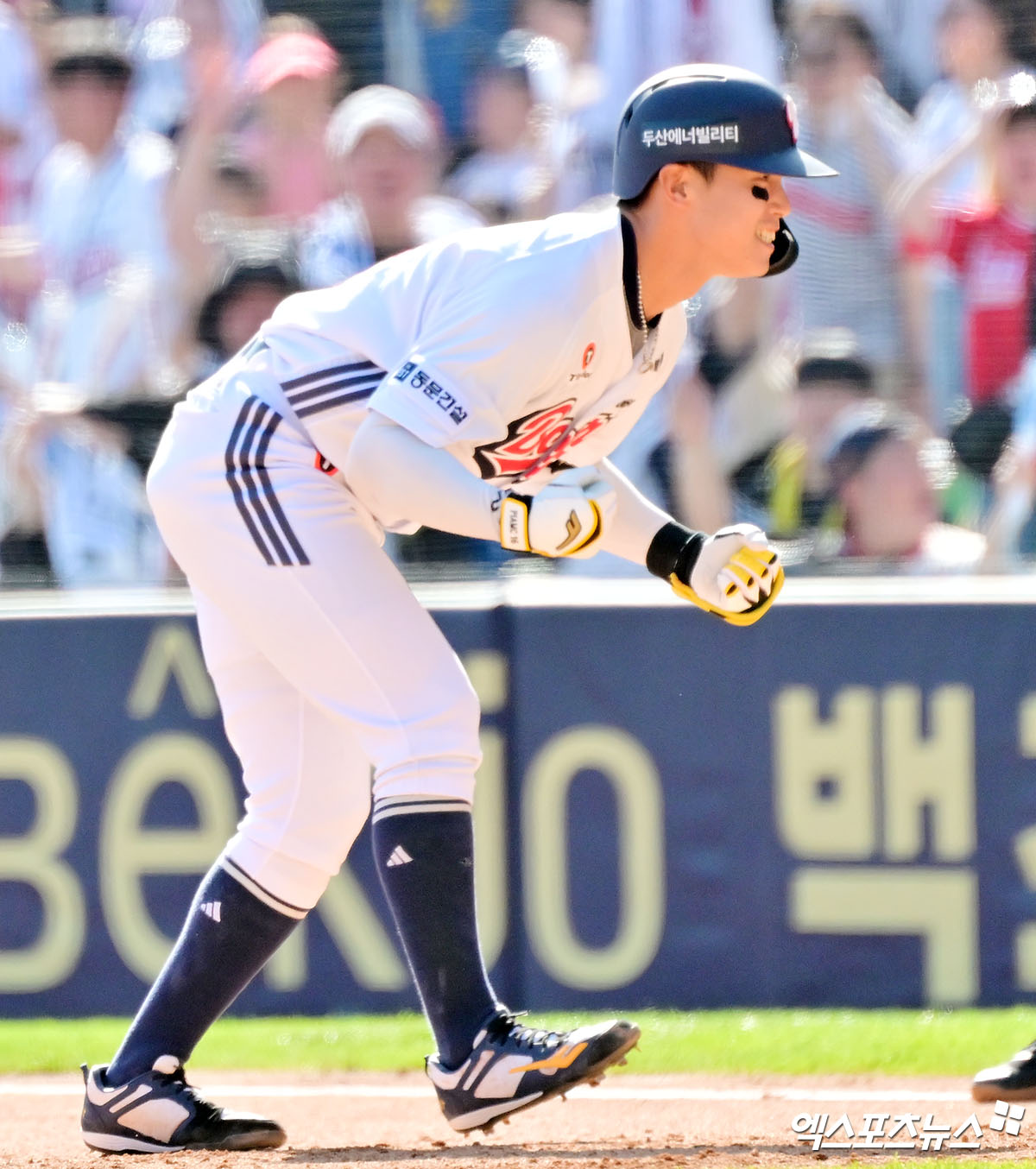 (엑스포츠뉴스 잠실, 김한준 기자) 20일 오후 서울 송파구 잠실야구장에서 열린 '2025 신한 SOL Bank KBO리그' KIA 타이거즈와 두산 베어스의 경기, 6회말 2사 2,3루 두산 박준영이 2타점 적시타를 날린 후 기뻐하고 있다.