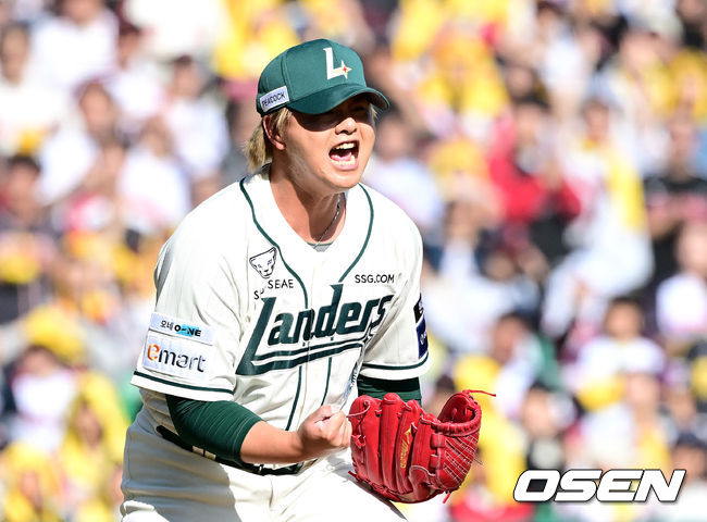 7회초 2사 1, 2루 상황 SSG 김민이 LG 박동원을 삼진으로 이끌며 환호하고 있다. 2025.04.20 / dreamer@osen.co.kr