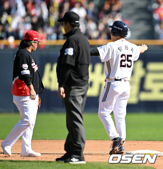 6회말 무사 1루에서 스타트를 끊은 1루주자 양의지가 도루 성공으로 착각해 두 손을 번쩍 들고 있다. 타자 양석환의 파울로 도루 기록이 안됐다. 2025.04.20 /sunday@osen.co.kr