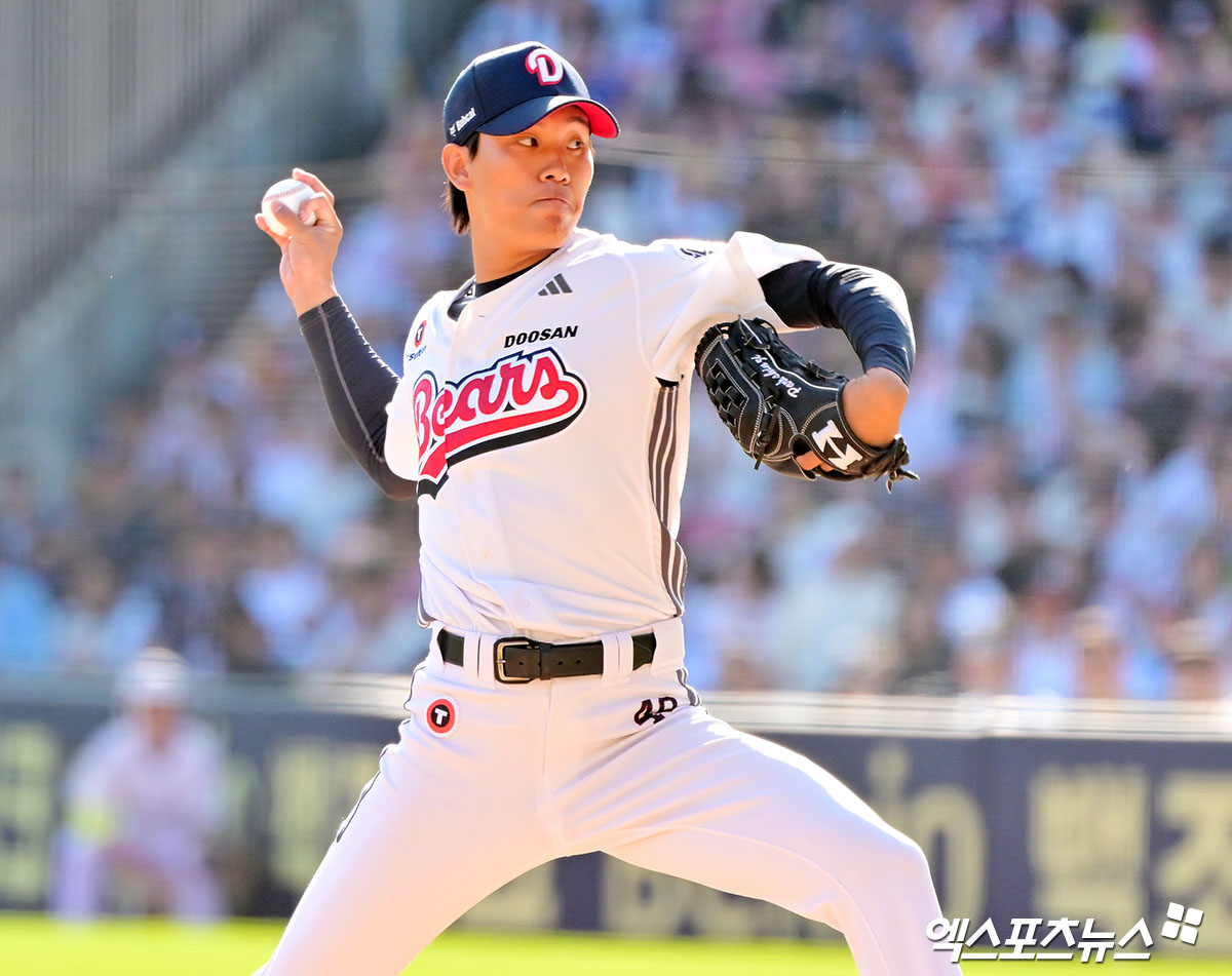 (엑스포츠뉴스 잠실, 김한준 기자) 20일 오후 서울 송파구 잠실야구장에서 열린 '2025 신한 SOL Bank KBO리그' KIA 타이거즈와 두산 베어스의 경기, 7회초 2사 1,3루 두산 박신지가 공을 힘차게 던지고 있다.
