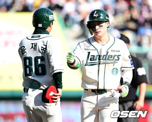 7회말 1사 만루 상황 SSG 최지훈이 달아나는 2타점 2루타를 날리고 2루에 안착해 윤재국 코치와 인사를 나누고 있다. 2025.04.20 / dreamer@osen.co.kr