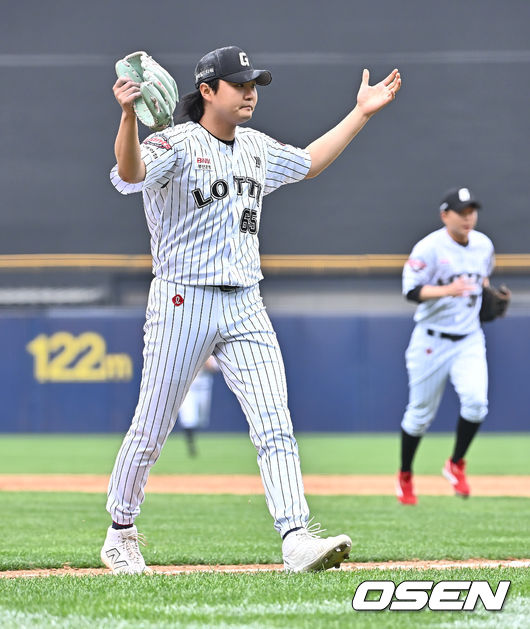 롯데 자이언츠 정철원이 8회말 수비를 무실점으로 막고 동료들에게 파이팅을 주문하고 있다. 2025.04.20 / foto0307@osen.co.kr