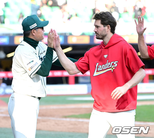 경기를 마치고 승리한 SSG 이숭용 감독과 승리투수 드류 앤더슨이 인사를 나누고 있다. 2025.04.20 / dreamer@osen.co.kr