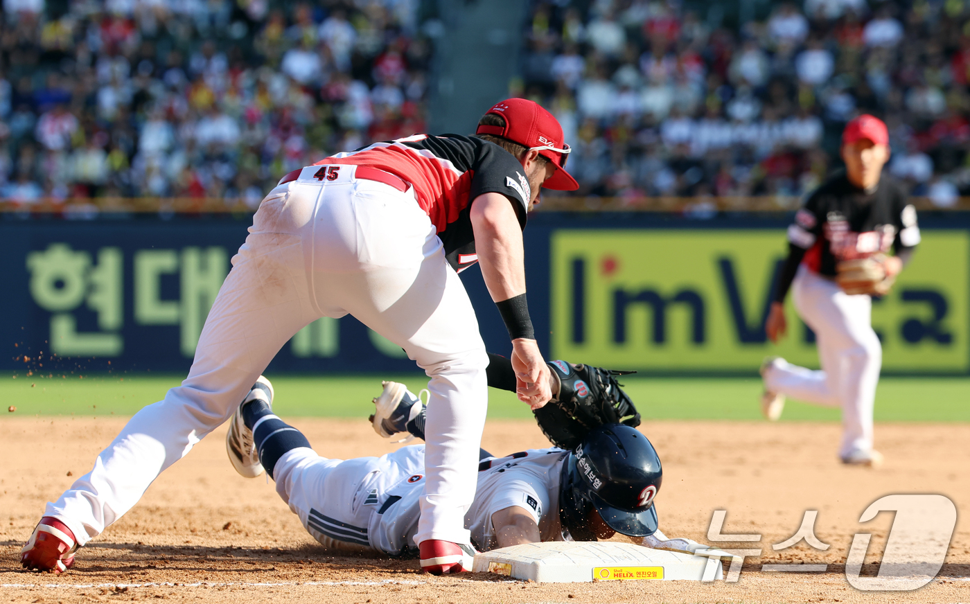 (서울=뉴스1) 김명섭 기자 = 20일 오후 서울 송파구 잠실야구장에서 열린 '2025 신한 SOL뱅크 KBO 리그' 기아 타이거즈와 두산 베어스의 경기에서 8회말 두산 공격 무사 1루 상황, 1루 주자 전다민이 견제 아웃되고 있다. 2025.4.20/뉴스1