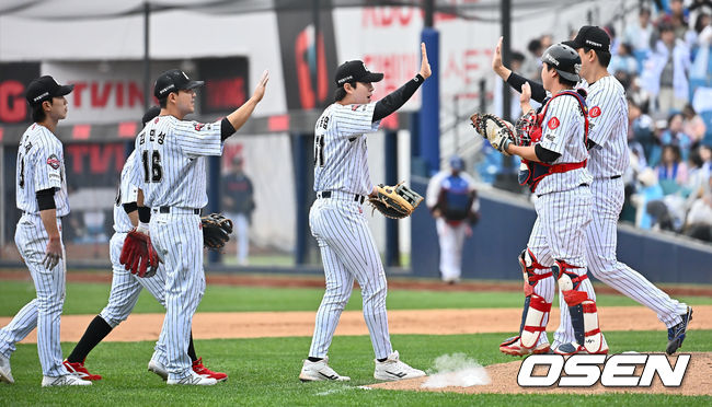 롯데 자이언츠 선수들이 삼성 라이온즈에 4-3으로 승리한 후 하이파이브를 하고 있다. 2025.04.20 / foto0307@osen.co.kr