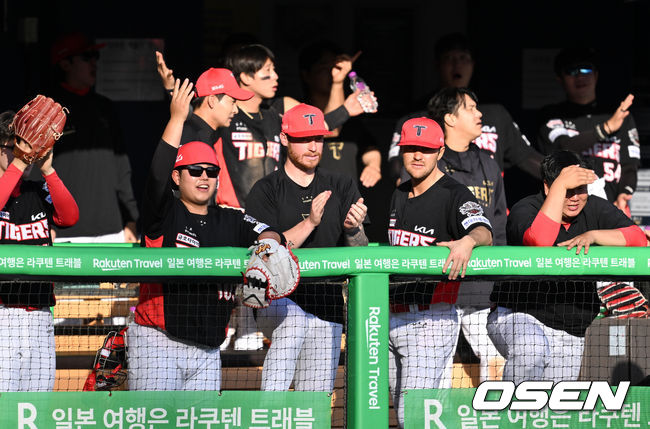 9회초 2사 3루에서 KIA 선수들이 한승택의 출루때 환호하고 있다. 2025.04.20 /sunday@osen.co.kr