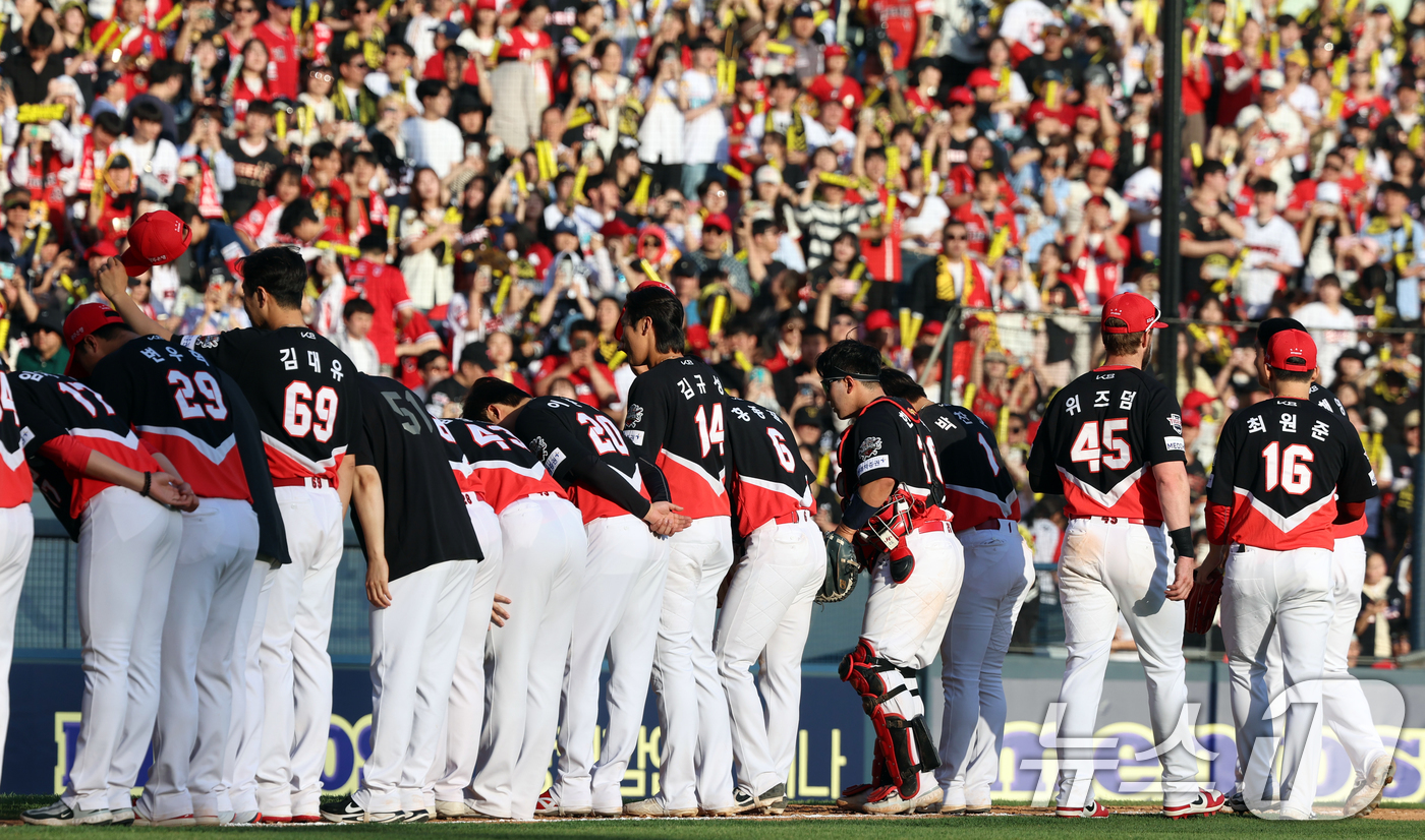 (서울=뉴스1) 김명섭 기자 = 20일 오후 서울 송파구 잠실야구장에서 열린 '2025 신한 SOL뱅크 KBO 리그' 기아 타이거즈와 두산 베어스의 경기에서 승리한 기아 선수단이 팬들에게 인사를 하고 있다. 2025.4.20/뉴스1