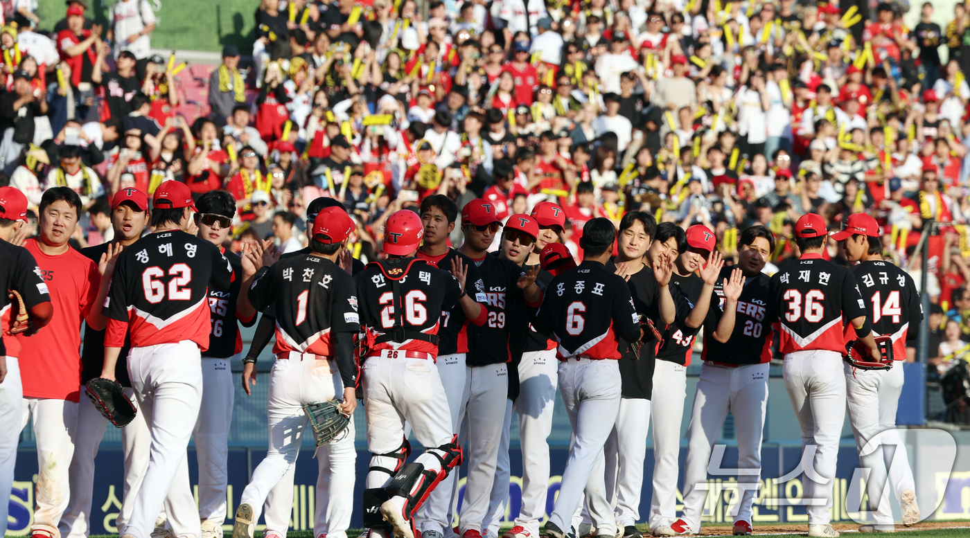(서울=뉴스1) 김명섭 기자 = 20일 오후 서울 송파구 잠실야구장에서 열린 '2025 신한 SOL뱅크 KBO 리그' 기아 타이거즈와 두산 베어스의 경기에서 승리한 기아 선수들이 하이파이블 하고 있다. 2025.4.20/뉴스1
