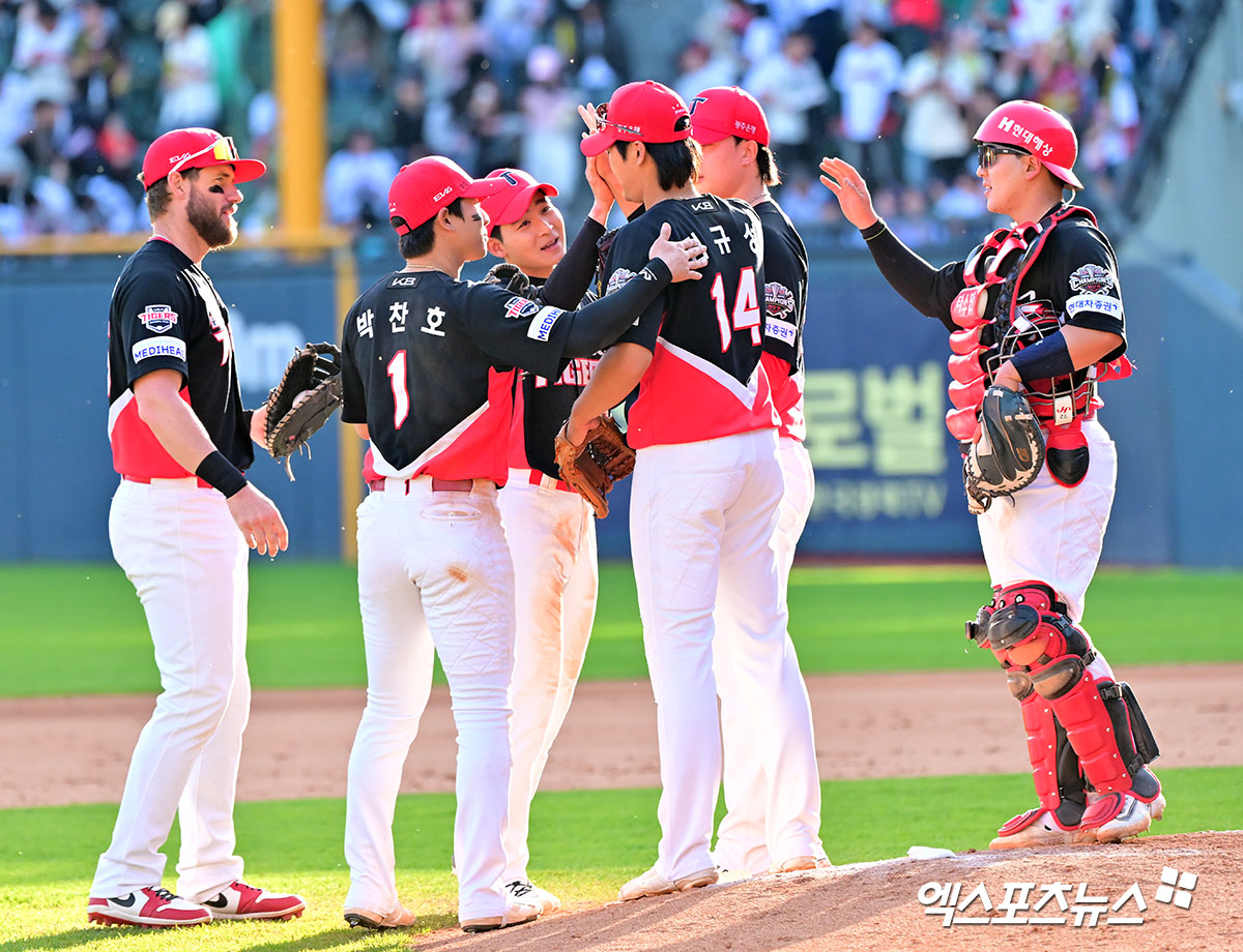 ​​​​​​​이날 경기에서 승리한 KIA 선수들이 기뻐하고 있다.