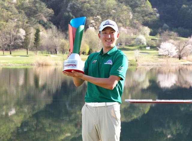 김백준이 20일 강원 춘천 라비에벨 골프앤리조트 올드코스에서 끝난 한국프로골프(KPGA) 투어 개막전 DB손해보험 프로미오픈에서 정상에 선 후 우승트로피를 들고 환하게 웃고 있다. KPGA 제공 |
