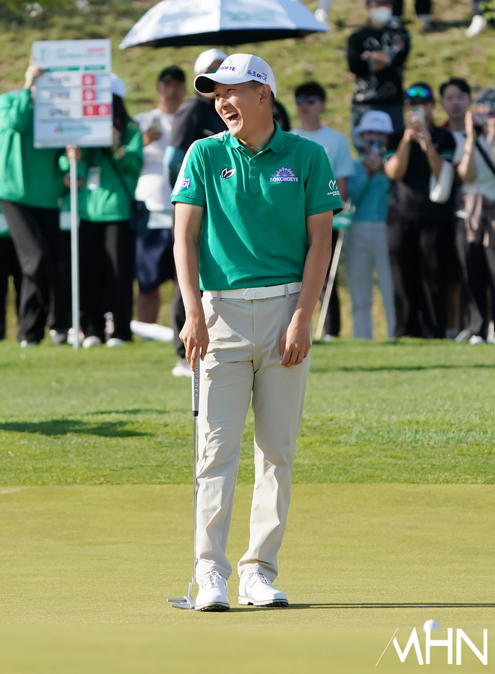 [mhn포토] 김백준 '캐디가 지나가는 실수에 웃음이~'