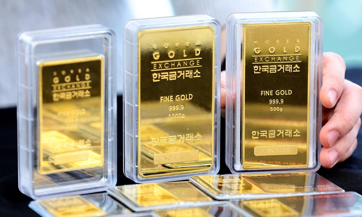 서울 종로구 한국금거래소 종로본점에 골드바가 진열돼 있다. 뉴시스 |