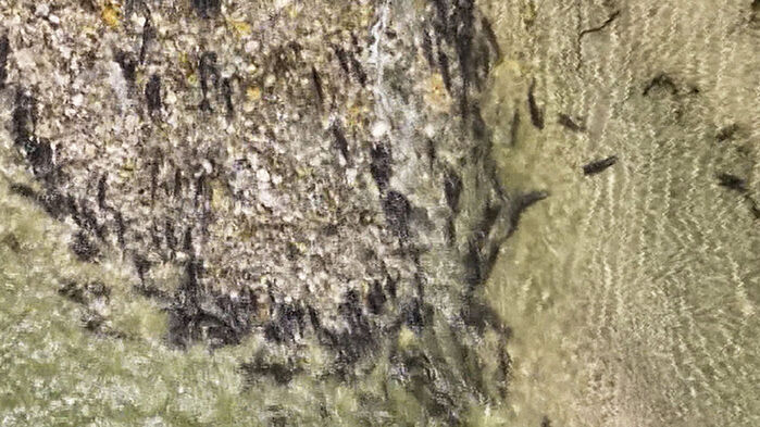 알을 않기 위해 바다에서 올라온 황어 떼로 수백 마리씩 떼를 지어 상류로 이동하는 중입니다.