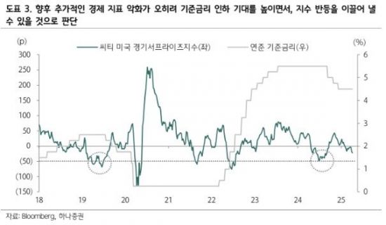 하나증권은 미국의 부진한 경제지표가 기준금리 인하 기대감을 끌어올리면서 지수 반등까지 이어질 수 있을 것으로 내다봤다.