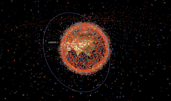 지구 주위를 돌고 있는 위성의 모습을 3D로 표현한 그림. 위성과 우주 쓰레기들이 모두 포함돼 있다. 파란선은 한 위성의 궤도를 표시한 것이다. 정상 궤도에서 벗어나거나 갑자기 지구로 떨어지는 궤도붕괴 위성이 발생하는 이유 중 하나가 우주 쓰레기와의 충돌이다. 로그 스페이스 시스템스(Rogue Space Systems) 제공. |