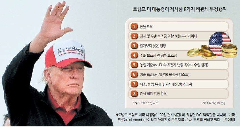 트럼프 대통령은 이날 자신의 사회관계망서비스(SNS) 트루스소셜에 전 세계 무역상대국이 미국을 상대로 그동안 취한 대표적인 ‘비관세 부정행위’(NON-TARIFF CHEATING)라며 8가지 유형을 나열했다.