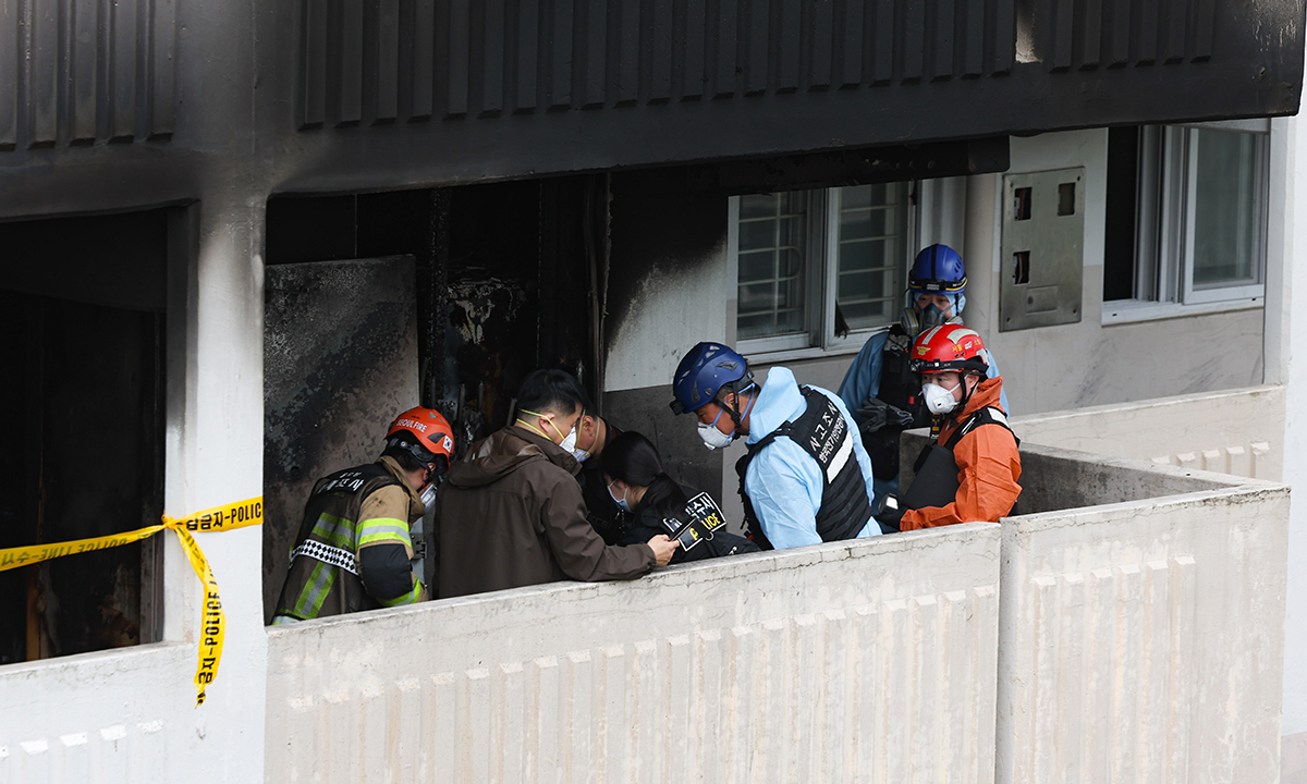 21일 서울 관악구 봉천동의 한 아파트에서 화재가 발생해 소방 및 경찰대원 등이 현장 감식을 하고 있다. 뉴시스 |