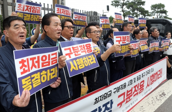 소상공인연합회 소속 회원들이 지난해 7월 2일 정부세종청사 고용노동부 앞에서 기자회견을 열고 최저임금 구분 적용 시행 및 동결을 촉구하고 있다. 세종 연합뉴스 |