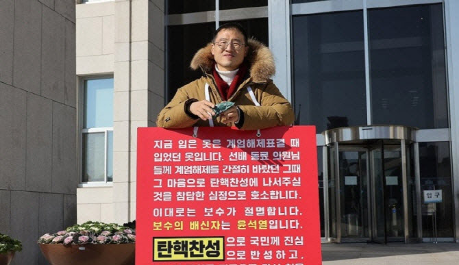 국민의힘 김상욱 의원이 14일 국회 본청 앞에서 동료의원들에게 탄핵 찬성에 나서줄 것을 호소하고 있다.(사진=연합뉴스) |