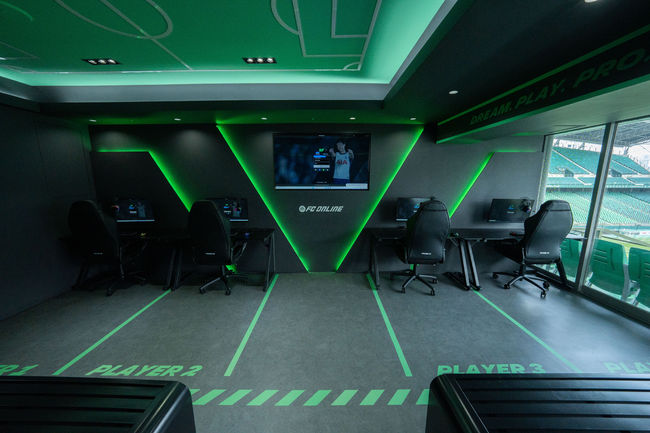 ‘FC 온라인 라운지’ 브랜딩 룸은 e스포츠 경기장과 현실 축구경기장의 경계를 허무는 트렌디한 분위기로 조성됐으며, 총 네 대의 PC와 중계 모니터를 비치하여 실시간으로 ‘FC 온라인’을 즐기며 축구 경기도 관람할 수 있는 독특한 재미를 느낄 수 있다.
