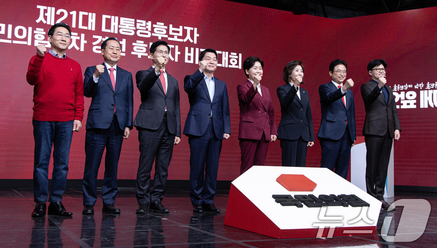 18일 오후 서울 강서구 ASSA아트홀에서 열린 '제21대 대통령후보자 국민의힘 1차 경선 후보자 비전대회' 에 참석한 후보들이 기념 촬영을 하고 있다. 왼쪽부터 유정복, 홍준표, 김문수, 안철수, 양향자, 나경원, 이철우, 한동훈 후보. 2025.4.18/뉴스1 ⓒ News1 이재명 기자 |