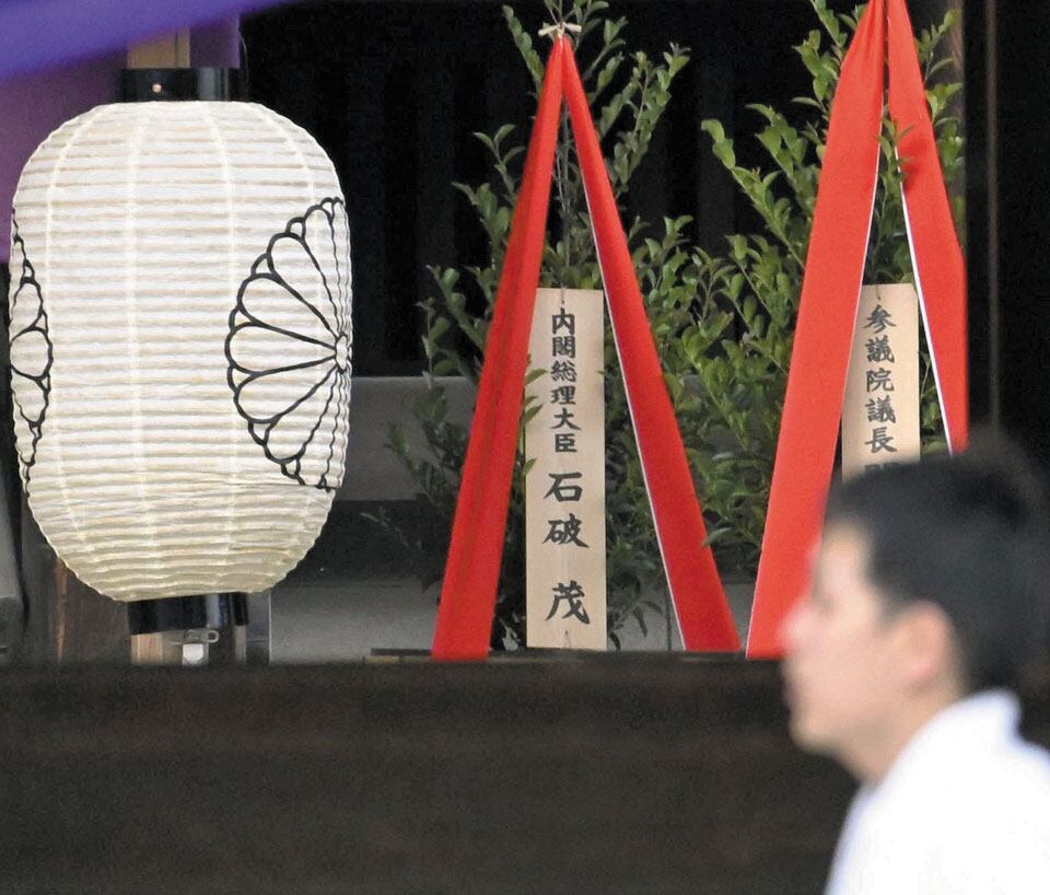 태평양 전쟁 A급 전범들이 합사된 일본 도쿄 야스쿠니 신사에 21일 이시바 시게루 일본 총리 명의의 공물이 놓여 있다. 이시바 총리는 공물을 봉납했지만 한국 등 주변국의 반발을 의식해 23일까지 계속되는 춘계 예대제(제사)에 신사를 참배하지는 않을 것으로 전망된다.