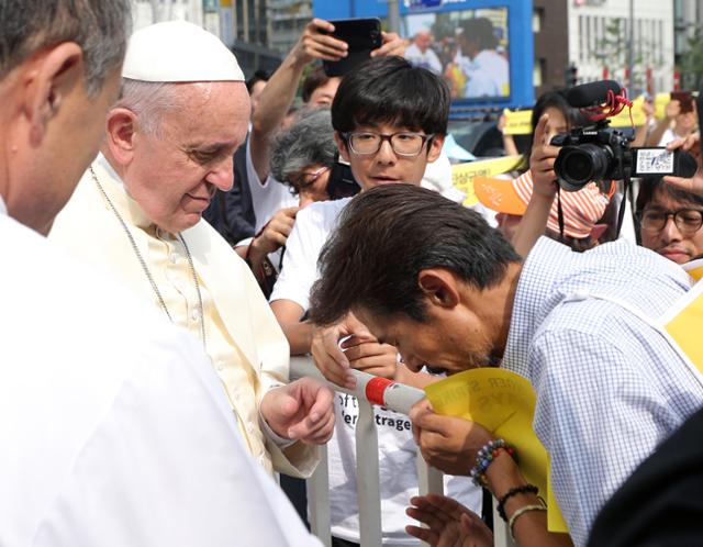프란치스코 교황이 방한 기간이었던 2014년 8월 16일 서울 광화문광장에서 열린 '윤지충 바오로와 동료 순교자 123위 시복식'에 앞서 카퍼레이드를 하던 중 세월호 참사 유족 김영오씨를 위로하고 있다. 연합뉴스 |