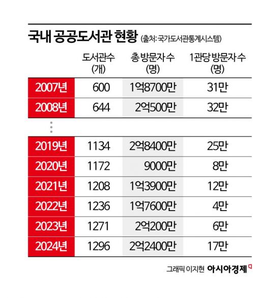 하지만 도서관 한 곳당 연간 방문자 수는 오히려 줄고 있다. 2007년 도서관 한 곳당 연평균 방문자 수는 31만명이었지만, 2019년에는 25만명, 2023년에는 15만명대로 감소했다. 도서관 수 증가 속도에 비해 방문자 증가 속도가 뒤처지고 있다는 분석이다. 실제로 방문자 증가율은 2021년 55%에서 2022년 26%, 2023년 15%, 올해는 11%로 점차 둔화되는 추세다.