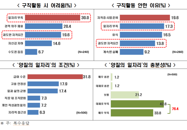 이어 △과도한 자격요건 및 스펙 요구(19.6%) △지속적 실패로 인한 자신감 저하 및 구직의욕 감소(14.6%) △일자리의 수도권 집중(6.7%) 등의 순으로 응답했다.