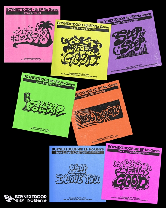 보이넥스트도어는 21일 오후 팀 공식 SNS에 미니 4집 '노 장르'의 트랙리스트를 공개했다. 노랑, 보라, 연두 등 다채로운 색상과 감각적인 글씨체를 통해 신보의 힙한 분위기를 전한다.
